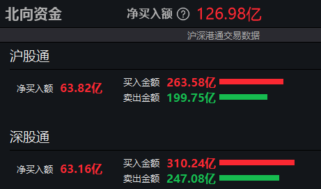 北向資金半日淨買入126.98億元。其中滬股通淨買入63.82億元,深股通淨買入63.16億元。