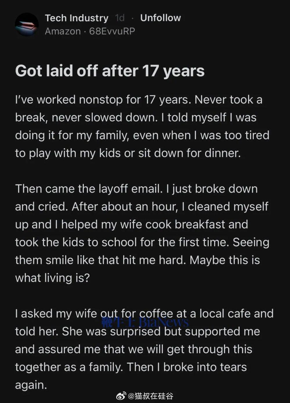 “自己連續工作了17年。從未休息,從未放慢腳步。我告訴自己,我是為了家人。然後裁員郵件來了。我徹底崩潰,哭了。一個小時後,我收拾好自己,幫妻子做早餐,第一次送孩子們上學。看到他們笑得那麼開心,真的很震撼我。也許,這才是生活?”