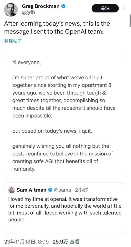 股票新聞 OpenAI管理層地震:CEO辭完總裁辭 11月18日 08:28 新浪網 新浪科技訊 北京時間11月18日早間消息,OpenAI總裁Greg Brockman稱辭去在OpenAI的職務。今日早些時候,因領導能力遭質疑,OpenAI首席執行官Altman辭職。