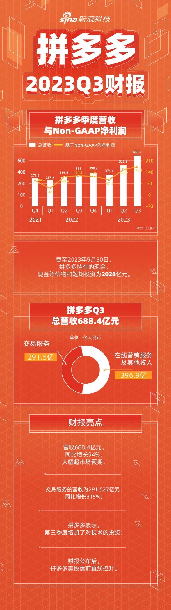 拚多多發佈2023第三季度財報:營收688.4億元,同比增長94%,大幅超過市場預期。其中,在線營銷服務及其他收入396.9億元,同比增長39%;交易服務收入291.5億元,同比增315%。第三季度,拚多多調整後淨利潤170.3億元,同比增長37%。
