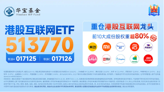 佈局工具上,港股互聯網ETF(513770)跟蹤中證港股通互聯網指數(931637),權重股彙聚騰訊控股、美團、小米集團、快手等不同互聯網細分賽道龍頭公司,其中持倉騰訊控股、美團、小米集團、快手、京東健康權重近70%,前十大成份股權重超80%,龍頭屬性突出。