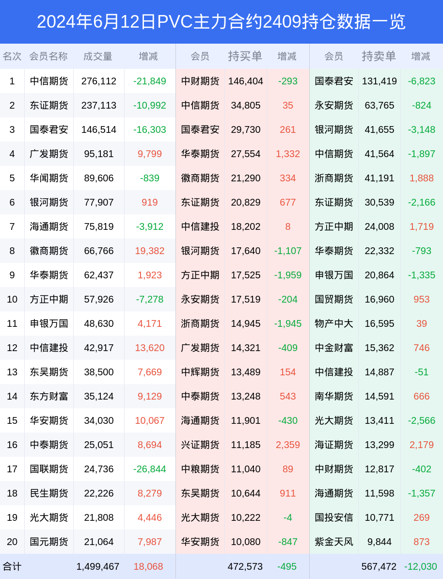 新浪期貨 根據交易所數據,截至6月12日15點收盤主力合約PVC2409,漲跌-0.38%,成交量110.18萬,持倉數據顯示前20席位呈現淨空,差額頭寸為94899。