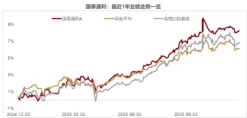 她管理的另一隻固收+代表作品,國泰通利A最近1年收益率8.29%,業績排名同類前28%(349/1267),同樣跑贏業績基準表現(6.14%)和同類基金平均水平(6.88%)。