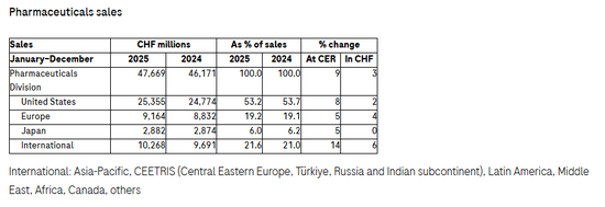 1 月 29 日,羅氏發佈 2025 年度財務報告,其中:全年營收 615.16 億瑞士法郎(約 743.67 億美元),同比增長 7%;製藥業務收入 476.69 億瑞士法郎(約 576.27 億美元),同比增長 9%。
