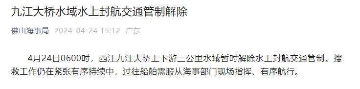 新京報訊 據佛山海事局微信公眾號消息,4月24日6時,西江九江大橋上下遊三公里水域暫時解除水上封航交通管製。搜救工作仍在緊張有序持續中,過往船舶需服從海事部門現場指揮、有序航行。