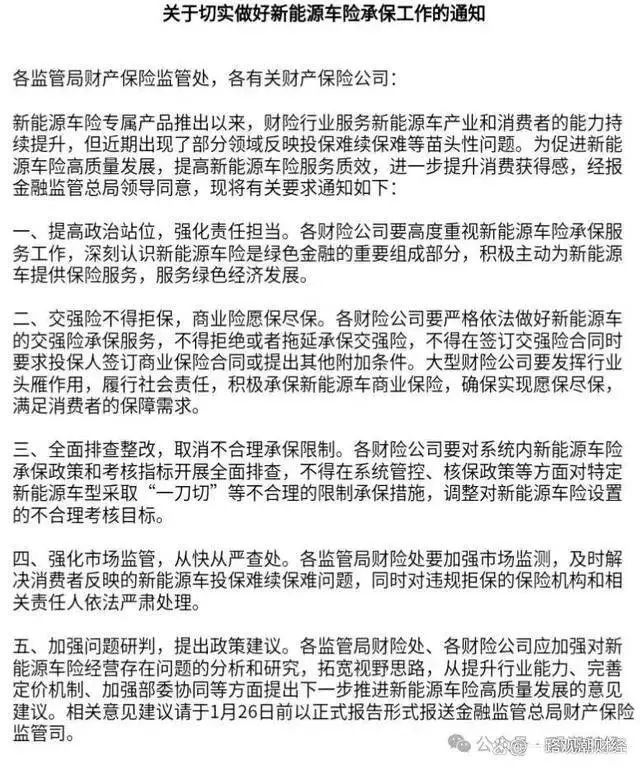 追夢人所說的政策指的是,2024年1月,國家金融監督管理總局向有關財產保險公司等加急下發的《關於切實做好新能源車險承保工作的通知》(以下簡稱《通知》),對新能源汽車承保的車險機構進行指導。