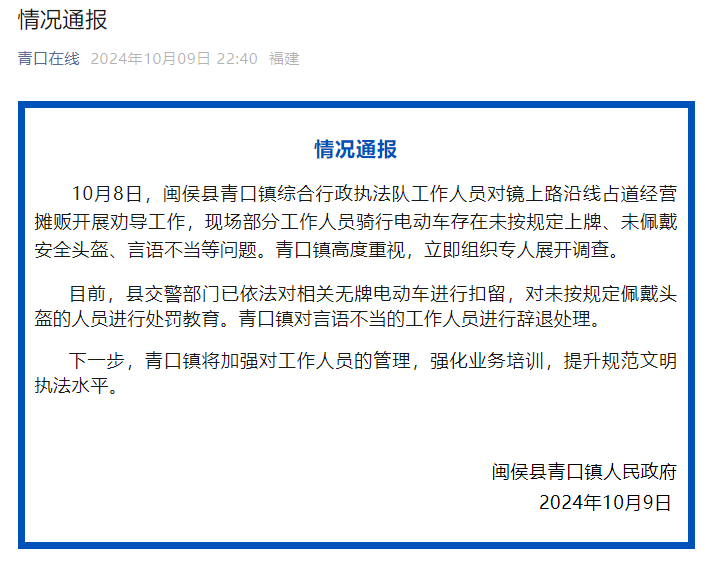 目前,縣交警部門已依法對相關無牌電動車進行扣留,對未按規定佩戴頭盔的人員進行處罰教育。青口鎮對言語不當的工作人員進行辭退處理。