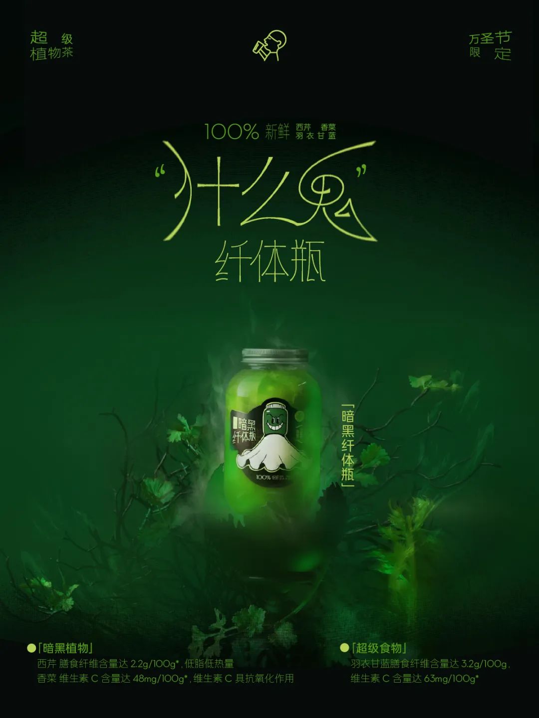 新品為萬聖限定,口味延續纖體瓶的羽衣甘藍口味,加入西芹和香菜兩種「暗黑食材」,帶來清新獵奇的風味體驗,並融合蘋果、鳳梨汁、檸檬汁和無香精綠妍茶湯。