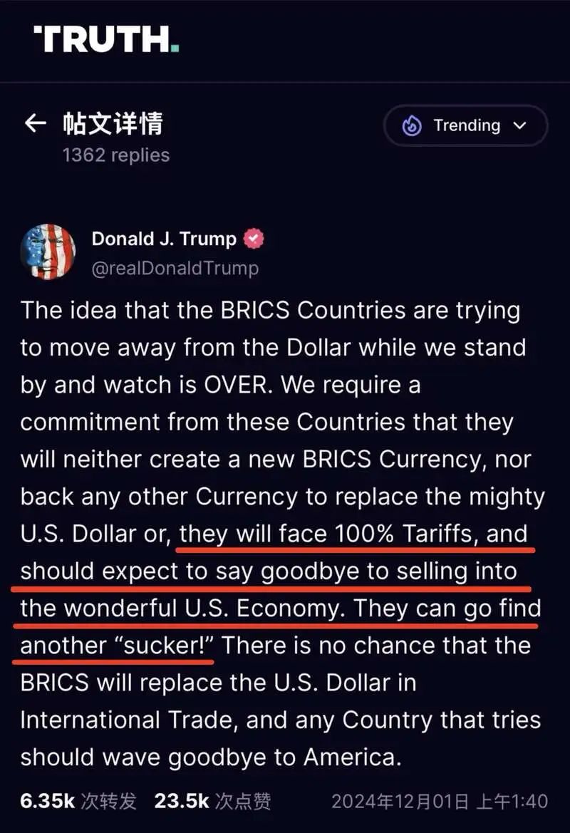 當地時間11月30日,美國當選總統特朗普在其創建的社交媒體平台上表示,要求金磚國家(BRICS)放棄創造新貨幣或支持美元替代品的計劃。他明確指出,若這些國家不遵守這一要求,將對挑戰美元在全球經濟中主導地位的國家徵收高額關稅,比例可能高達100%。