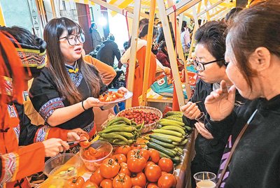11月28日,遊客在廣西壯族自治區柳州市融安縣長安鎮騎樓老街的夜市品嚐當地新鮮的瓜菜。喻湘泉 攝(人民圖片)
