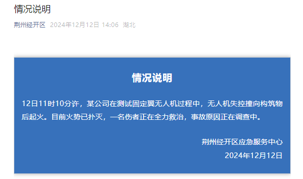 湖北荊州一無人機失控撞向構築物後起火,官方:一名傷者正全力救治