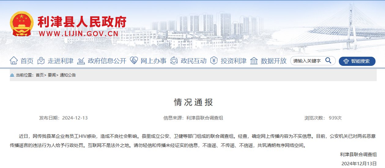 新京報訊 12月13日,山東利津縣聯合調查組發佈情況通報,近日,網傳利津縣某企業有員工HIV感染,造成不良社會影響。縣里成立公安、衛健等部門組成的聯合調查組。經查,確定網上傳播內容為不實信息。目前,公安機關已對兩名惡意傳播謠言的違法行為人給予行政處罰。互聯網不是法外之地。請勿輕信和傳播未經證實的信息,不造謠、不傳謠、不信謠,共築清朗有序網絡空間。