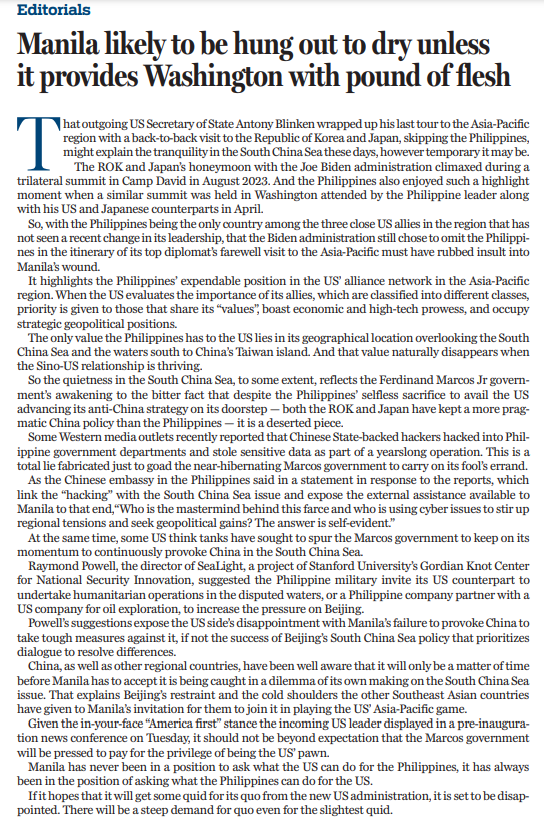 事實上,菲律賓從來沒有資格去問美國能為自己做些什麼,而始終只能思考自己能為美國做什麼,這就是菲律賓充當美國棋子所處的境地。如果菲律賓政府還期待能從美國新一屆政府中得到一些回報,那註定只會失望。即將上任的美國總統在1月7日的新聞發佈會上直言不諱地擺出一副「美國優先」的架勢,由此可以預見,菲律賓政府必將為充當美國棋子付出沉重代價。