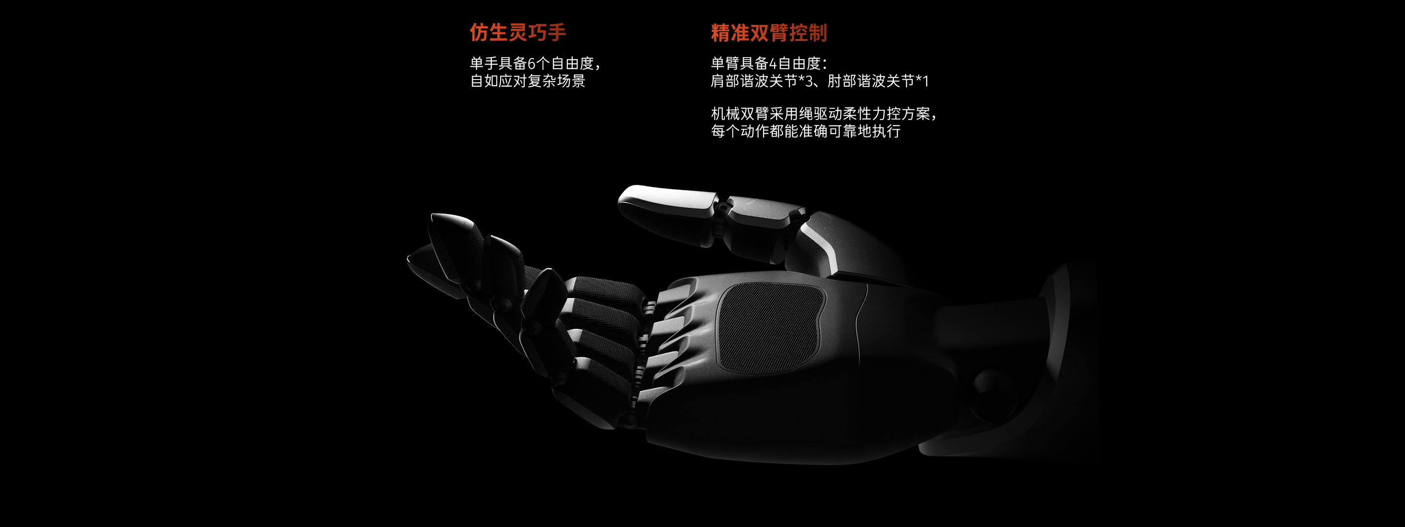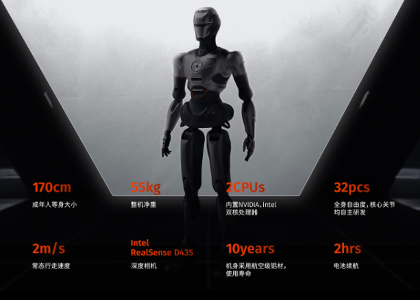 其採用自主研發的一體化諧波關節模組,整機共32個自由度(12個在手部、8個在臂部),是全球首創使用端到端神經網絡方式將機器人步態提升到真人標準的產品。該機器人高達170cm,採用航空級鋁材,重約55kg,關節最大扭矩330N•m,常態行走速度可達2m/s,電池續航時間兩小時,使用壽命10年。