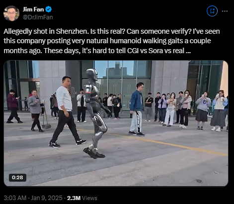 英偉達高級AI研究科學家Jim Fan轉發其行走影片並感歎:「這是真的嗎?」Jim Fan甚至懷疑這是由AI影片生成工具Sora生成的。