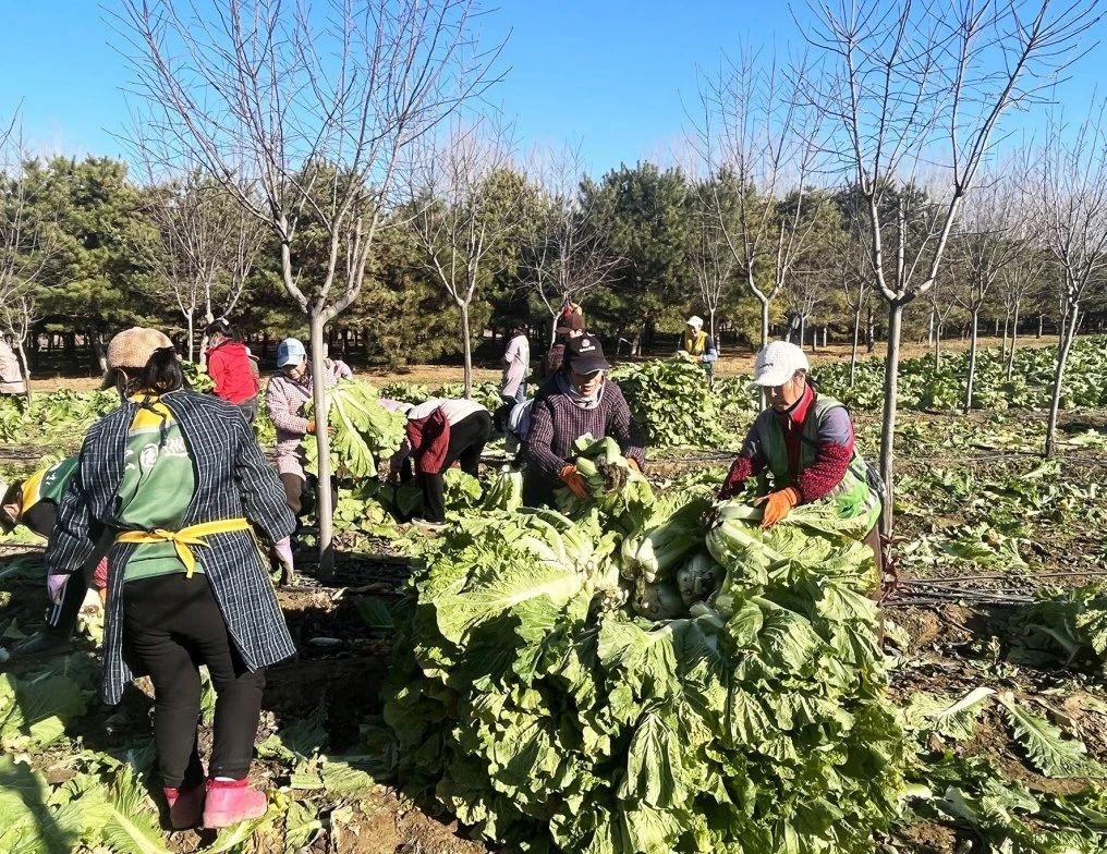 霜降過後,初冬暖陽格外討喜。於家務集體林場的白菜種植區迎來了大豐收。大白菜棵棵飽滿、翠綠鮮嫩。連日來,工人趁著天晴忙著砍白菜、精揀、分類……田間地頭,一派熱火朝天。