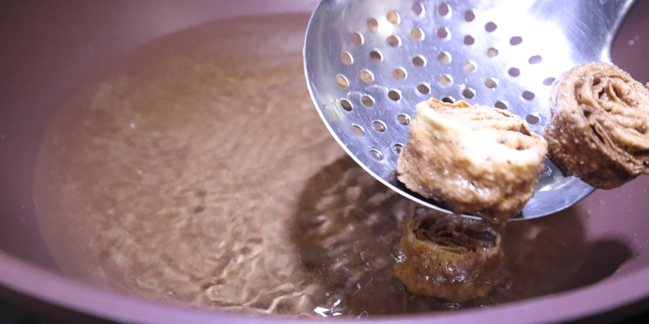 看著女兒女婿陷入迷茫,張秀琴進行了複盤:捲裹時太緊了,導致餎餷餄個頭小不說,裡外熟得還不同步;炸貨時不夠麻利,前後拖的時間太久,也造成了顏色不均勻。