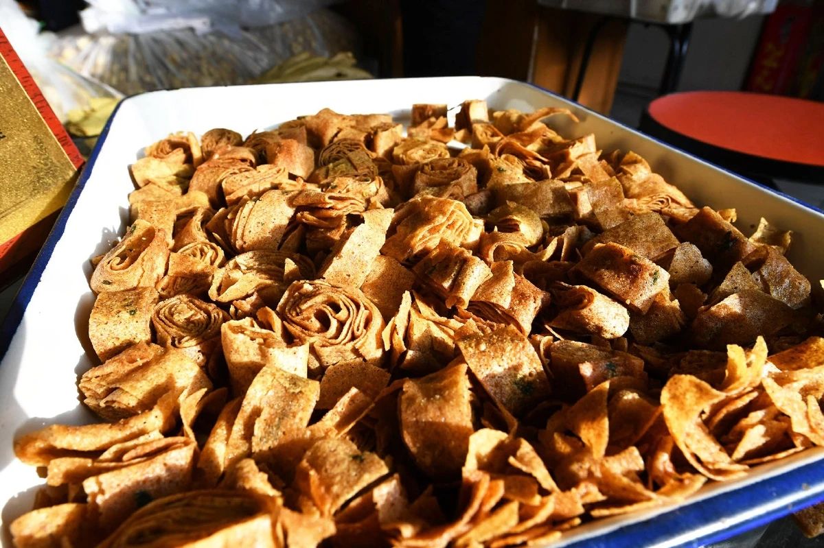 在張秀琴的指導下,王陽和媳婦再次改良了卷法。捲好的咯吱鬆而不散,像是窗戶上的冰花一樣有著獨特的數學美感。下鍋俐落,起鍋乾淨,成品鬆脆可口。小兩口親曆了一次非遺的傳承,也讓這道京東小吃通過電商平台走向了更多家庭。