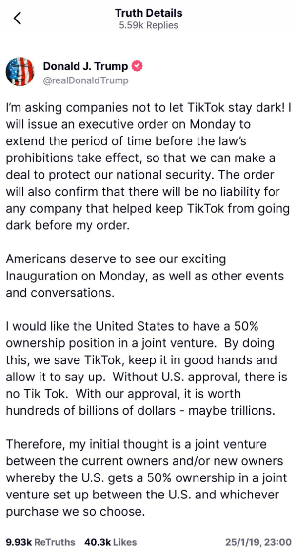 香港時間1月19日深夜,美國當選總統特朗普在社交媒體發文稱,將於週一(1月20日)發佈一項行政命令,延長TikTok禁令法定生效前的時限。他還稱,在行政命令下達前,任何協助TikTok避免關停的公司都無需承擔責任。