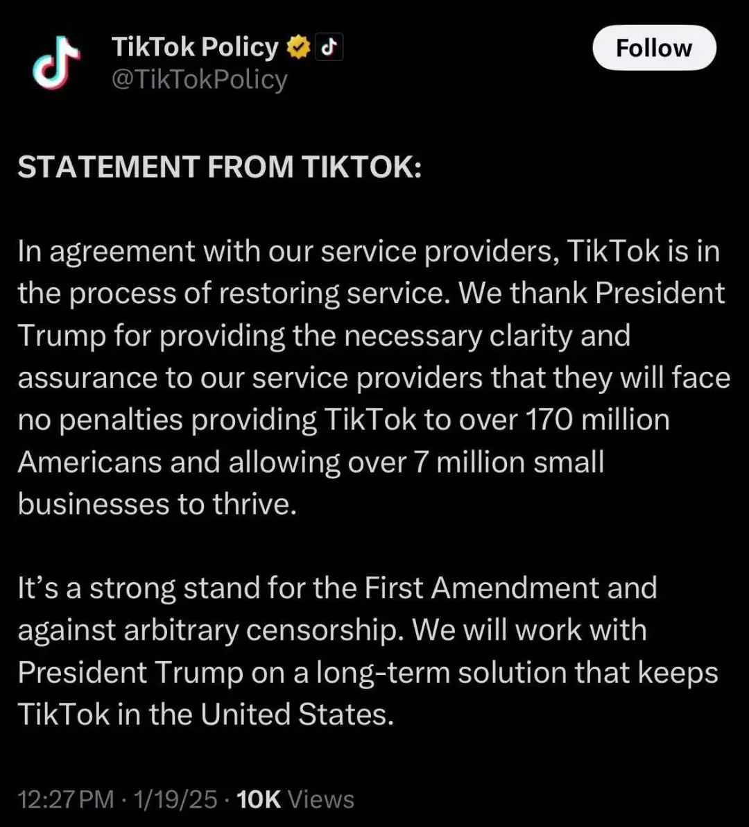 美國西岸時間19日9時30分(香港時間20日1時30分)左右,TikTok在社交媒體上發佈聲明說,公司已與互聯網服務提供商達成一致,正在恢復相關服務。記者隨即查看,TikTok應用程序已恢復正常使用,TikTok網站也已恢復正常。