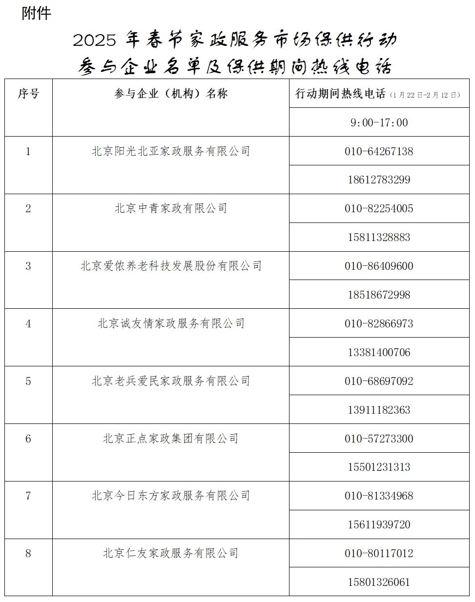 經自主申報、資格審核和對外公示,現確定北京陽光北亞家政服務有限公司等8家家政服務企業為春保行動參與企業(名單見附件),確定北京小熊美家科技有限公司為春保行動組織單位。