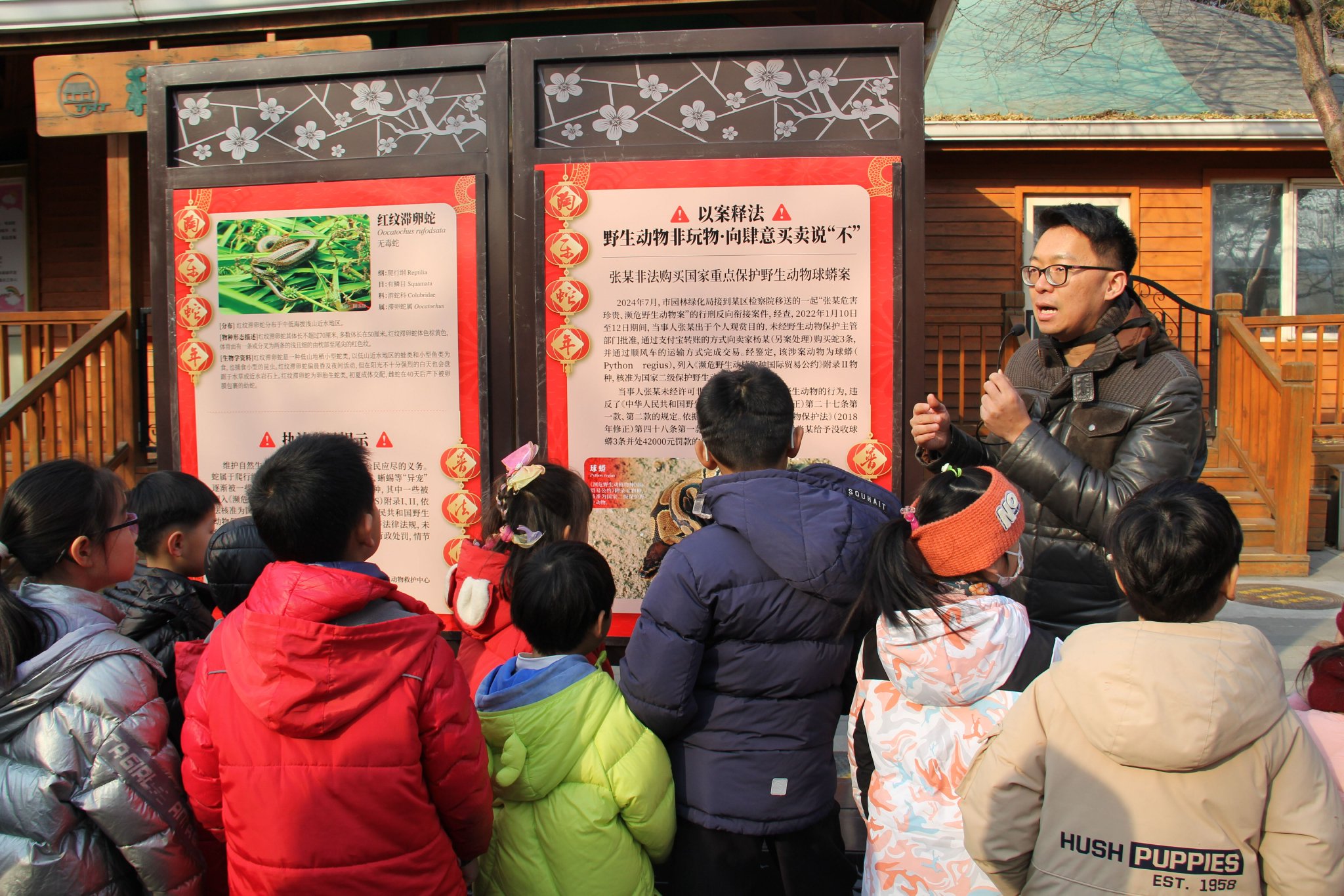 1月23日,北京市園林綠化局執法處工作人員以案釋法,向公園遊客介紹非法獵捕、交易、飼養、運輸「異寵」行為的違法風險。北京市園林綠化局執法處供圖