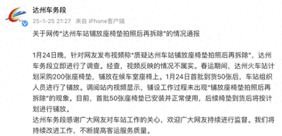 1月25日晚,成都鐵路局達州車務段官方微博發佈情況通報,回應網傳「達州車站鋪放座椅墊拍照後再拆除」。