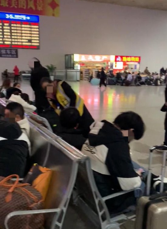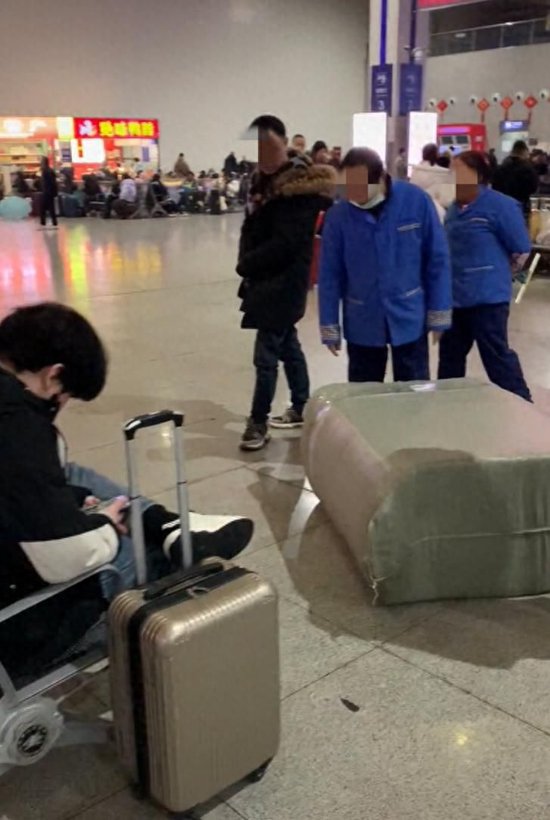 其上傳的現場影片顯示,幾名穿藍色工服的工作人員從乘客前走過,其中一人胳膊下夾了七八個棉墊子,現場還有一大捆尚未拆包的墊子。一名穿車站工服的女工作人員在把墊子鋪在鋁合金椅子上。