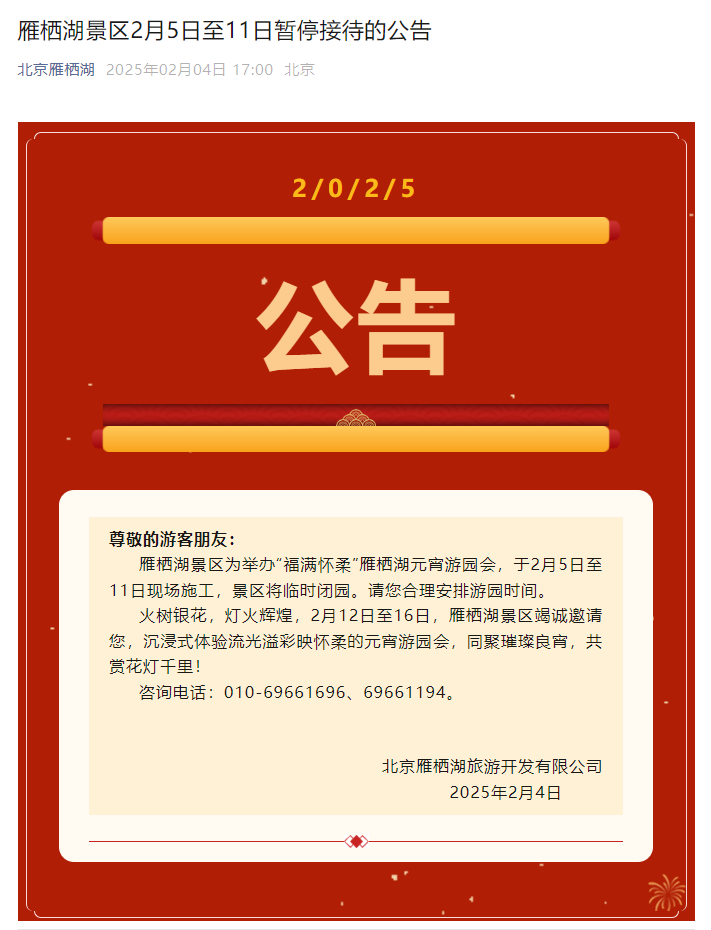 中國新聞 北京雁棲湖景區2月5日至11日暫停接待 02月05日 15:52 新浪網 news-china-auto-hilite 新京報訊 據北京雁棲湖官微消息,雁棲湖景區為舉辦「福滿懷柔」雁棲湖元宵遊園會,於2月5日至11日現場施工,景區將臨時閉園。 諮詢電話:010-69661696、69661194 編輯 劉佳妮