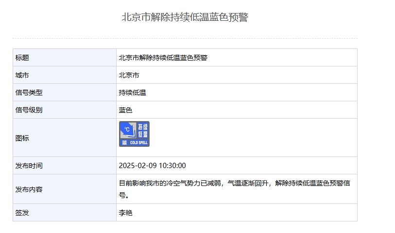 新京報訊 據北京市氣象局網站消息,北京市解除持續低溫藍色預警,目前影響我市的冷空氣勢力已減弱,氣溫逐漸回升,解除持續低溫藍色預警信號。