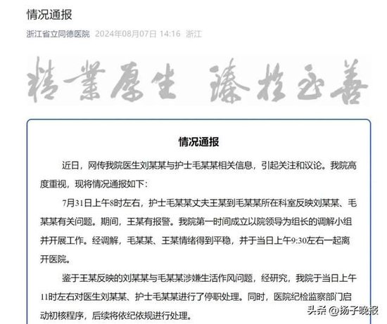 王超離去後5日,即2024年8月7日,浙江省立同德醫院發佈通報稱,7月31日上午8時左右,護士毛某某丈夫王某到毛某某所在科室反映劉某某、毛某某有關問題。其間,王某有報警。該院第一時間成立以院領導為組長的調解小組並開展工作。經調解,毛某某、王某情緒得到平穩,並於當日上午9:30左右一起離開醫院。
