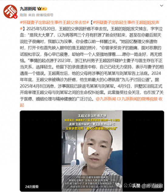 事情的起點源於2024年,浙江杭州男子王超因懷疑護士妻子與醫生存在不正當關係,選擇輕生。他留下的錄音遺言中稱,自己已經無力堅持,表示與妻子的相遇是一個錯誤。