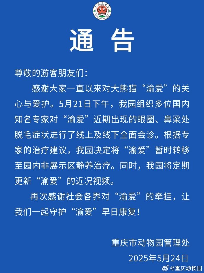 中國新聞 重慶動物園回應大熊貓「渝愛」脫毛症狀:轉移至非展示區靜養治療 05月24日 22:15 新浪網 news-china-auto-hilite 新京報訊 5月24日,重慶動物園微博發佈通告,詳情如下: 編輯 毛天宇