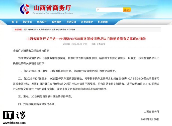 10 月 9 日起,山西暫停汽車置換更新補貼及電動單車以舊換新補貼