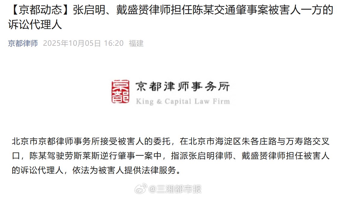 #陳震再致歉稱律師全力配合處理# 10月5日,京都律師事務所發文:北京市京都律師事務所接受被害人的委託,在北京市海澱區朱各莊路與萬壽路交叉口,陳某駕駛勞斯賴斯逆行肇事一案中,指派張啟明律師、戴盛贇律師擔任被害人的訴訟代理人,依法為被害人提供法律服務。