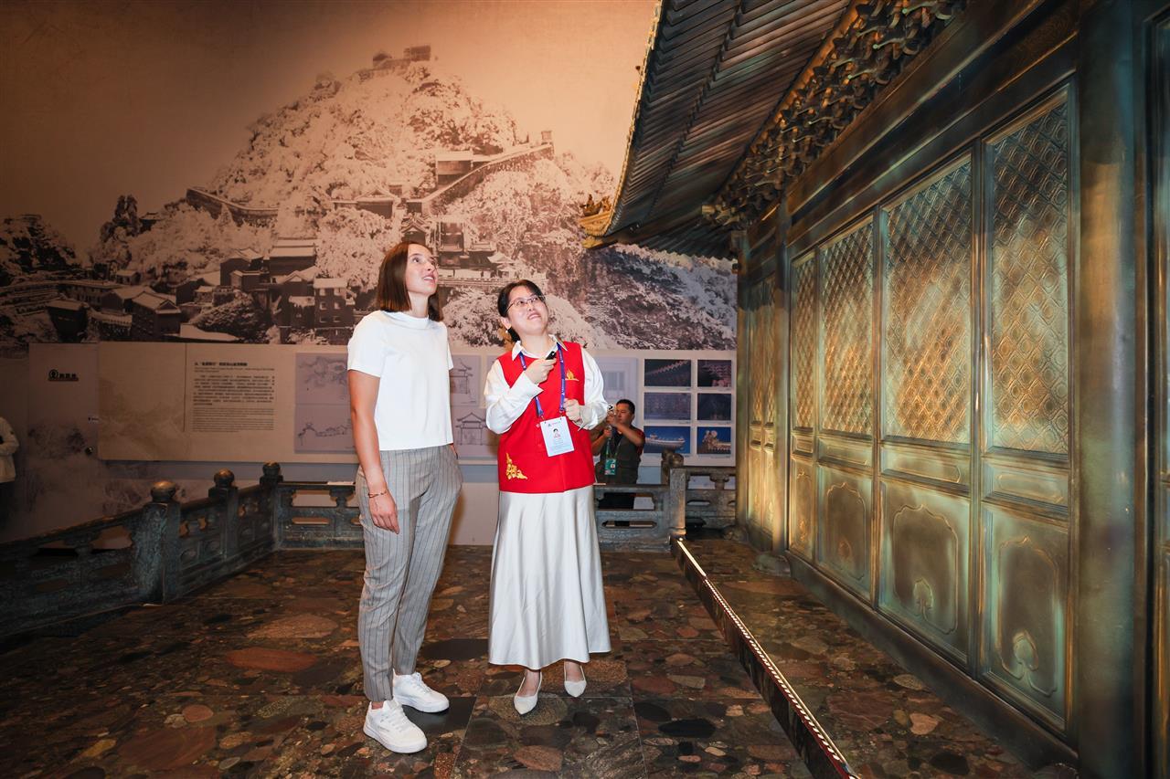 斯瓦泰克在種子造型的科技館外留影,隨後在講解中仰望繪有古代星圖的穹頂,領略「天圓地方」的建築智慧,並深入瞭解武當山金頂與黃鶴樓的構造奧秘。
