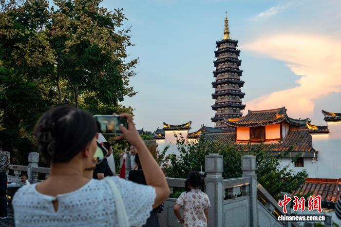 10月5日,遊人拍攝夕陽下的金華。國慶假期,位於浙江金華的婺州古城打造全域沉浸式互動空間,吸引大量遊客前來參觀遊覽。中新社記者 吳君毅 攝