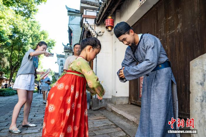 10月5日,遊人與NPC(非玩家角色)互動。國慶假期,位於浙江金華的婺州古城打造全域沉浸式互動空間,吸引大量遊客前來參觀遊覽。中新社記者 吳君毅 攝