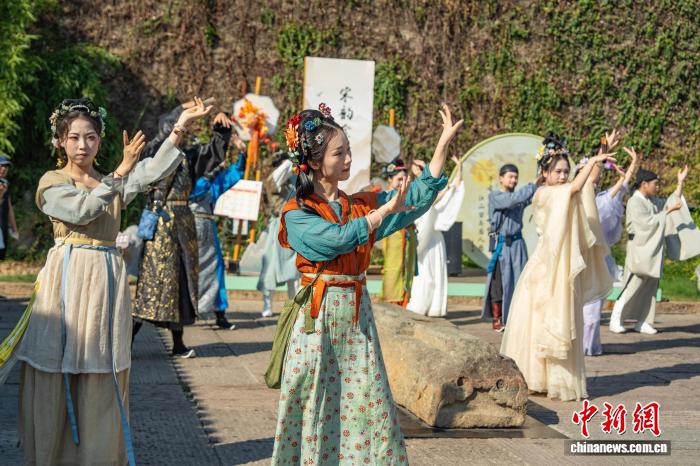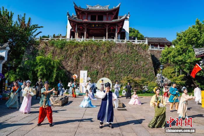 10月5日,婺州古城內八詠樓前的國風快閃。國慶假期,位於浙江金華的婺州古城打造全域沉浸式互動空間,吸引大量遊客前來參觀遊覽。中新社記者 吳君毅 攝