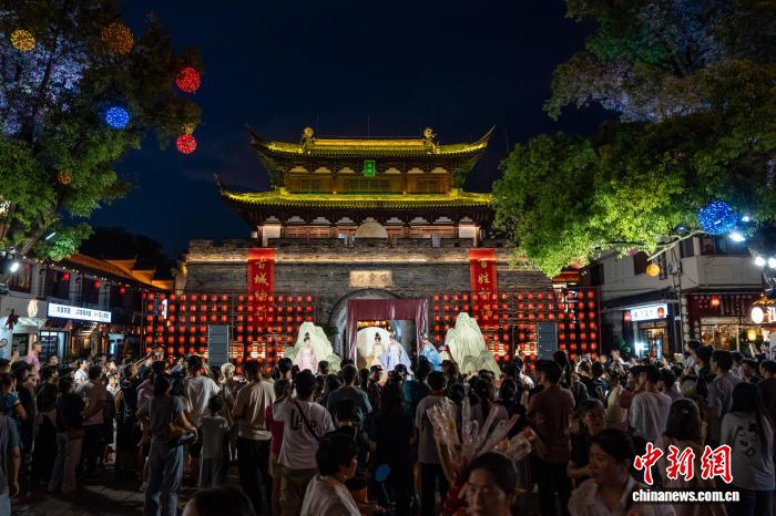 10月5日,夜晚婺州古城內的演出。國慶假期,位於浙江金華的婺州古城打造全域沉浸式互動空間,吸引大量遊客前來參觀遊覽。中新社記者 吳君毅 攝