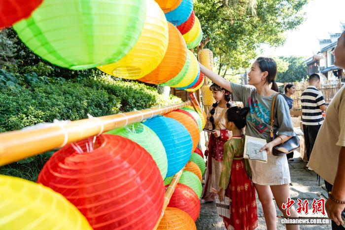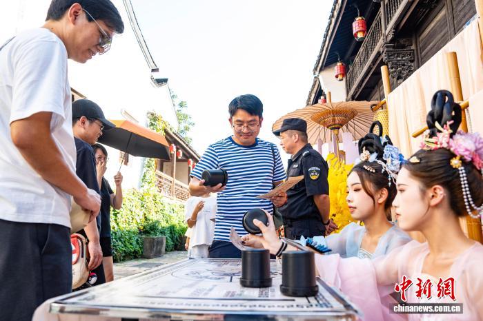 10月5日,遊人在婺州古城參與猜字謎遊戲。國慶假期,位於浙江金華的婺州古城打造全域沉浸式互動空間,吸引大量遊客前來參觀遊覽。中新社記者 吳君毅 攝