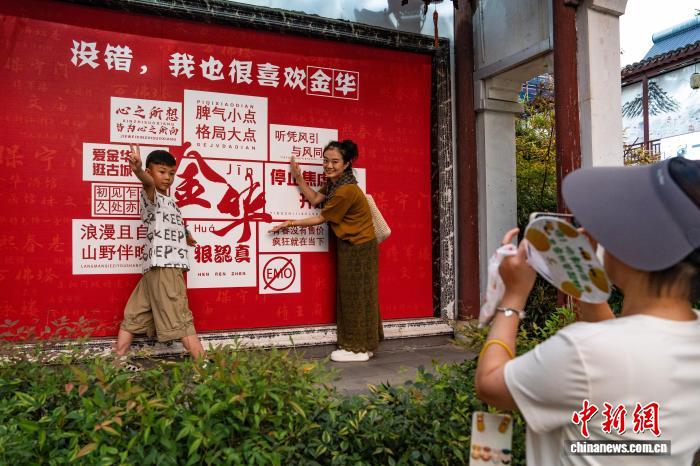 10月5日,遊人在婺州古城打卡拍照。國慶假期,位於浙江金華的婺州古城打造全域沉浸式互動空間,吸引大量遊客前來參觀遊覽。中新社記者 吳君毅 攝