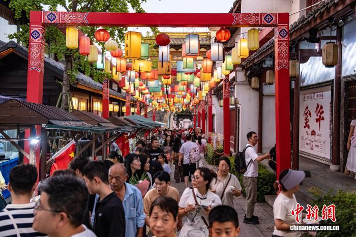 10月5日,大量遊人參觀遊玩婺州古城。國慶假期,位於浙江金華的婺州古城打造全域沉浸式互動空間,吸引大量遊客前來參觀遊覽。中新社記者 吳君毅 攝