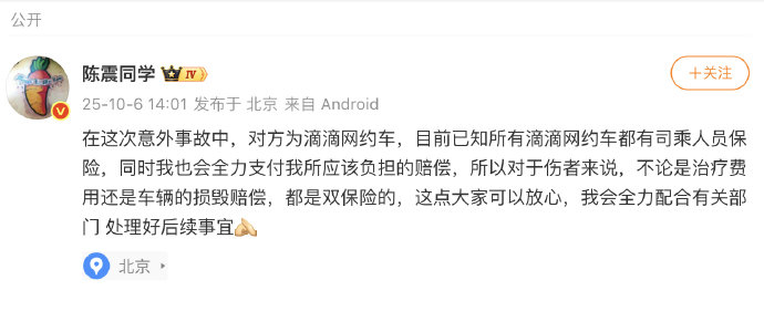 陳震還稱:「昨天從有關部門得到傷者家屬聯繫方式,第一時間打電話過去道了歉,詢問了傷者情況,同時跟家屬大概說了一下事故經過,並表示此刻我有什麼能為他們做的,以及能否去探望,目前家屬答覆是希望一起在交通隊事故科見面並商量後續解決事宜。」