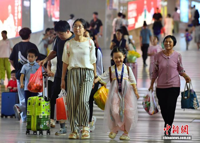 10月6日,乘坐列車抵達福州站的旅客。當日是國慶中秋假期第六天,鐵路客流保持高位運行,中短途客流增多,全國鐵路預計發送旅客1640萬人次,計劃加開旅客列車1164列。中新社記者 張斌 攝