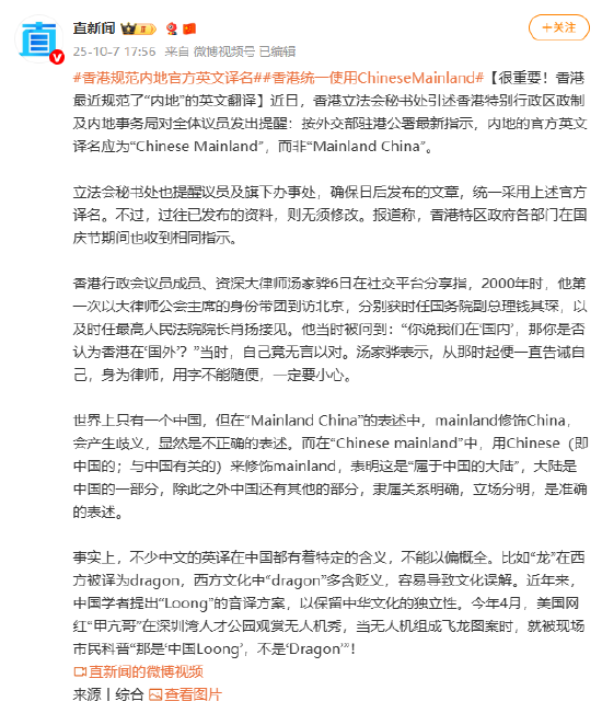 #香港規範內地官方英文譯名##香港統一使用ChineseMainland#[很重要!香港最近規範了「內地」的英文翻譯]近日,香港立法會秘書處引述香港特別行政區政製及內地事務局對全體議員發出提醒:按外交部駐港公署最新指示,內地的官方英文譯名應為「Chinese Mainland」,而非「Mainland China」。