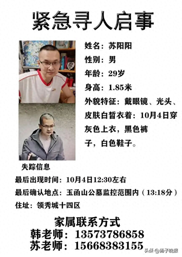 另據齊魯晚報,「他身高1米85,戴眼鏡,光頭,失聯當天穿灰色上衣,黑色褲子,白色鞋子。」蘇陽陽家屬說。