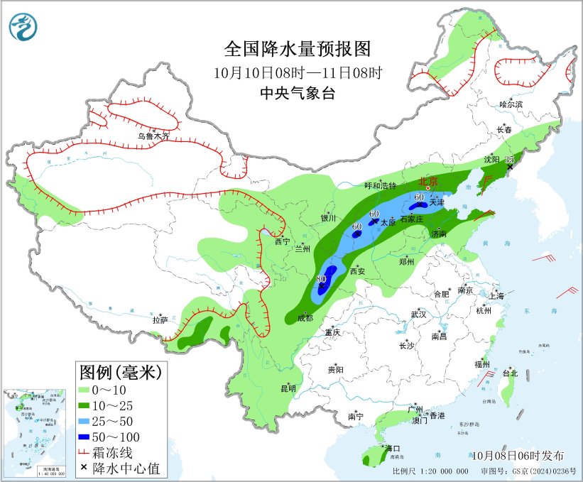 10月10日08時至11日08時,遼寧東區、四川東北部、甘肅東區、寧夏南部、陝西北部、山西中北部、京津冀、山東北部等地部分地區有中到大雨,其中,四川東北部、甘肅東區、陝西北部、山西中部、河北中部等地部分地區有暴雨(50~80毫米)。遼東半島、山東半島等地部分地區有4~5級風。