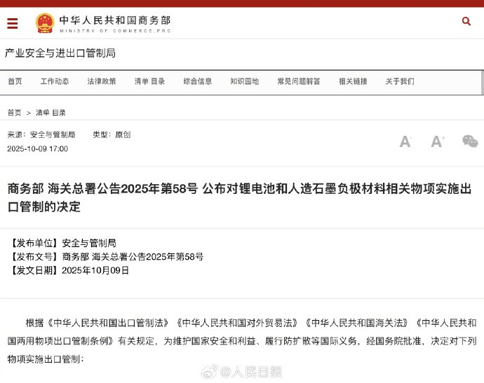 #鋰電池出口管製##人造石墨負極材料出口管製#【商務部、海關總署:對鋰電池和人造石墨負極材料相關物項實施出口管製】今天,商務部、海關總署發佈公告,公佈對鋰電池和人造石墨負極材料相關物項實施出口管製的決定。內容如下:
