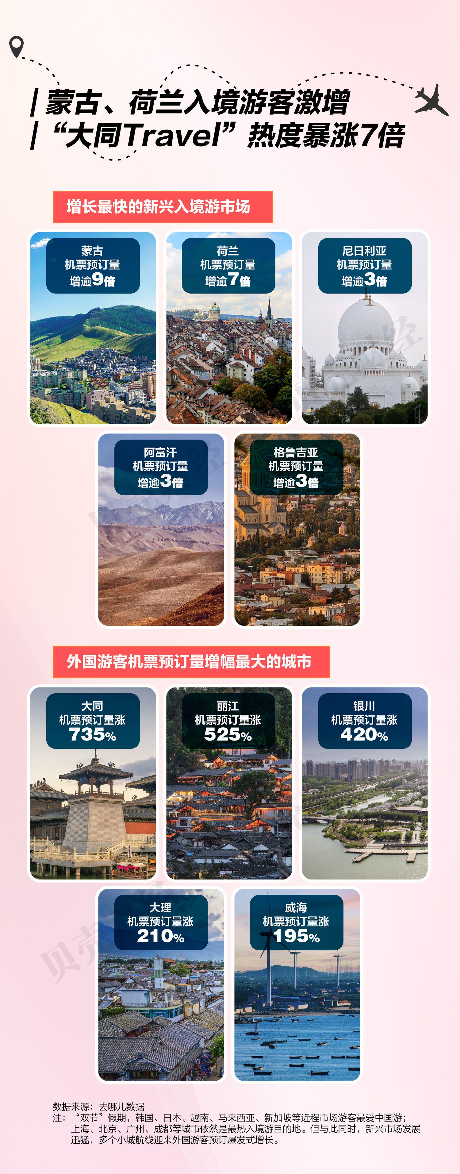 去哪兒數據也顯示,今年國慶中秋長假期間,使用非中國護照預訂國內航班的機票量同比增長33%,多個小城航線迎來外國遊客預訂爆髮式增長。其中,山西大同拔得頭籌,外國遊客預訂量增超7倍,麗江增超5倍。